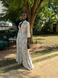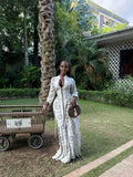 This white maxi dress features an intricate black geometric abstract pattern throughout. The plunging V-neckline and long sleeves add a touch of glamour and sophistication. The row of buttons on the front is both practical and aesthetically pleasing.
